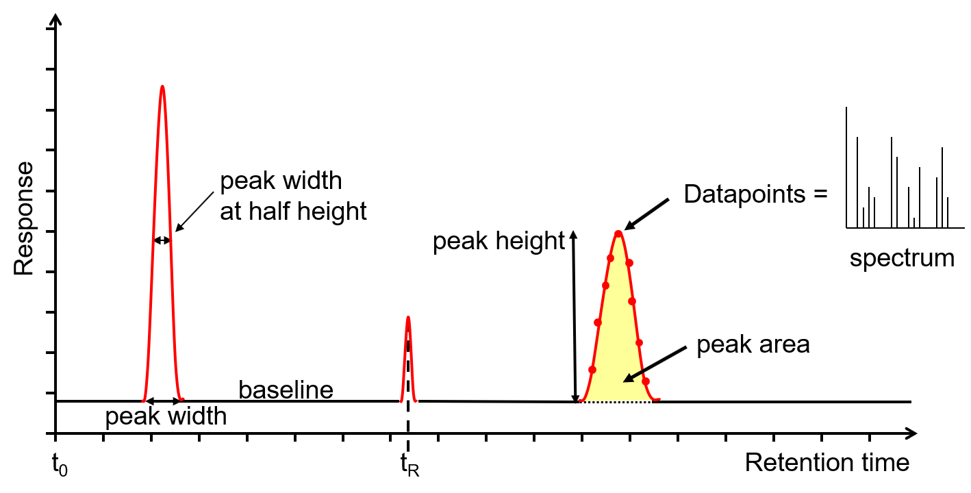 在这里,单个峰值的区域与它们的浓度有关,它们的保留时间代表了它们的身份。