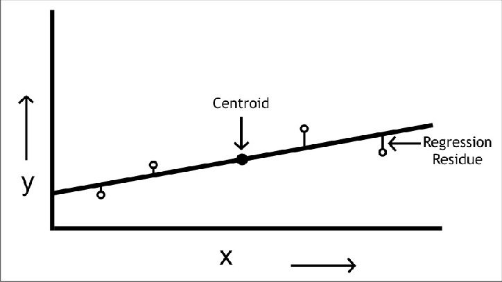 在所有点不落在一条直线上的定标图中,应用线性回归。回归线使直线与各个点之间在Y方向上的残差距离最小化,并通过数据的质心(X和Y的平均值)。